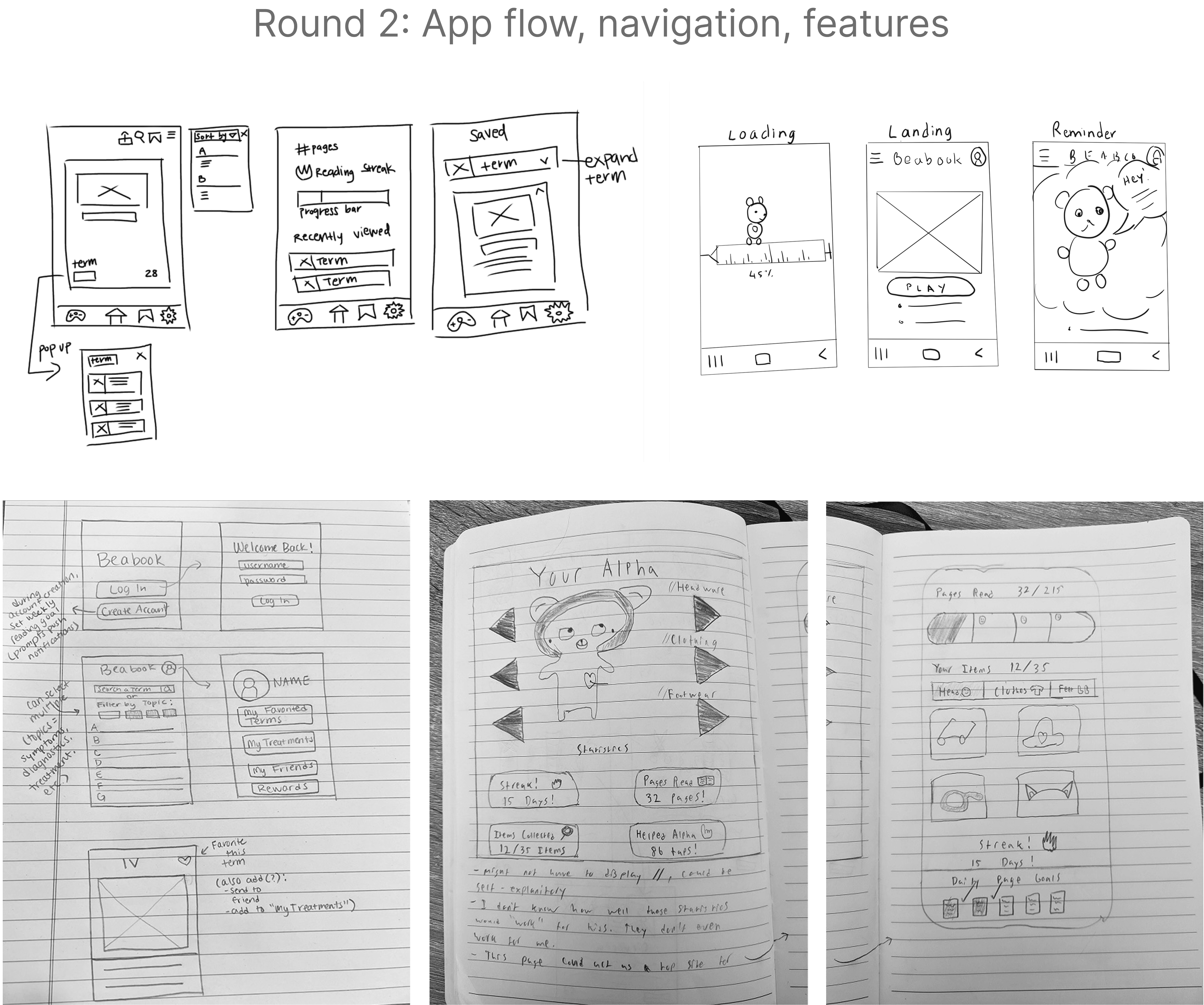 Based on research insights, I conducted two rounds of paper sketching, focusing on gamification elements, book organization, and navigation. Through ideating, I learned how important it is to share (visual) ideas with the team early and often, as it helps identify misalignments before progressing further.