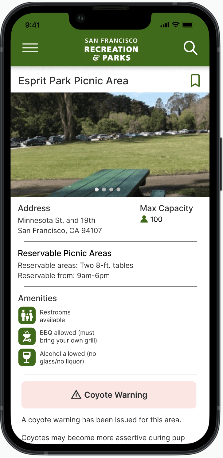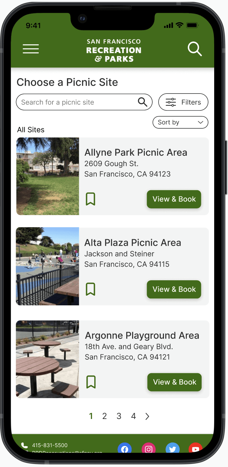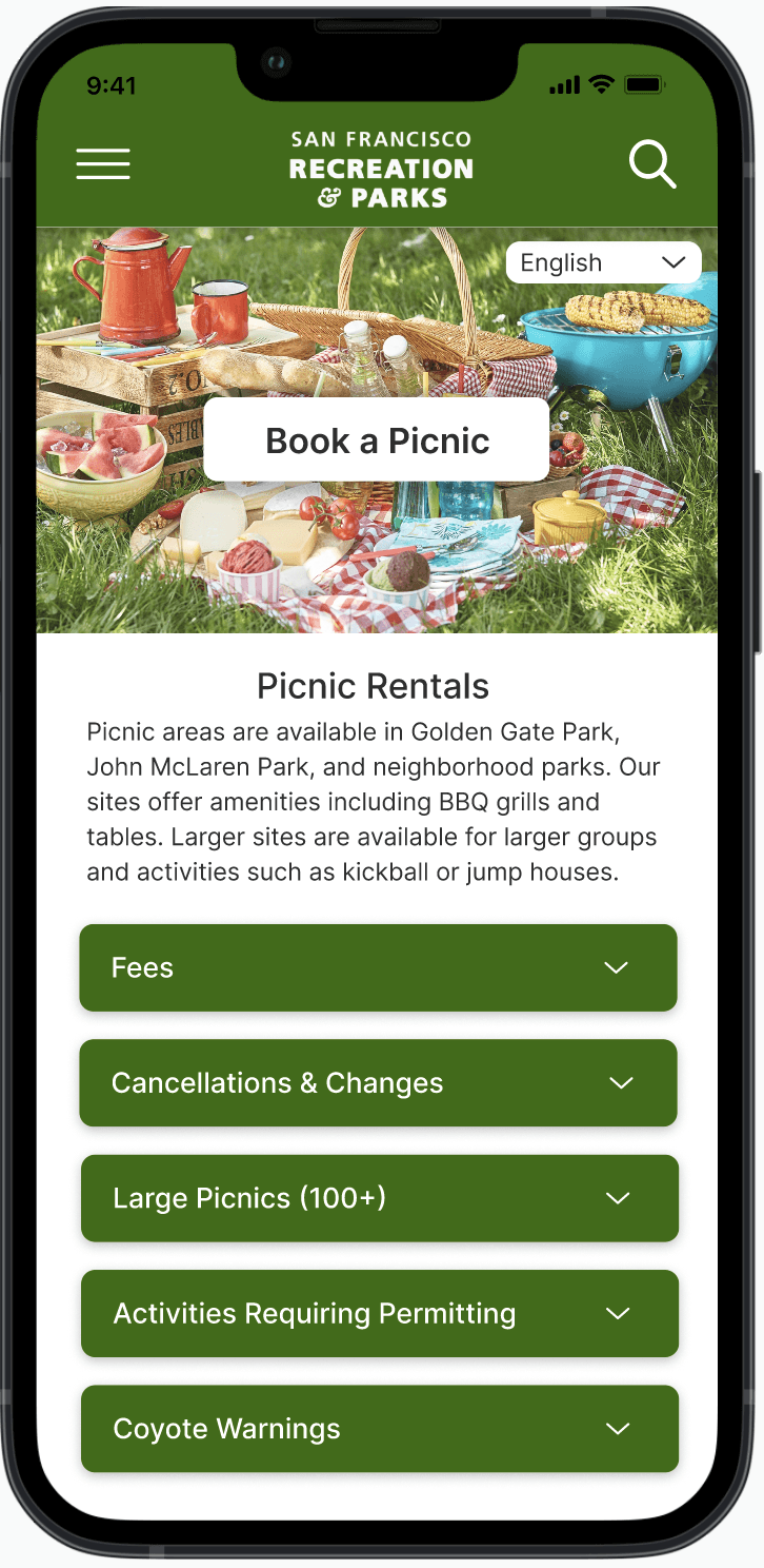 The San Francisco Recreation & Parks Department is the city agency responsible for governing and maintaining all city-owned parks and recreational facilities in SF. This was a full-cycle design project where I redesigned the end-to-end online picnic reservation flow for the SF Rec & Parks mobile web, streamlining an originally complicated 8-step process into a 4-step, simple and intuitive process that includes finding and selecting a picnic site through searching, filtering, and sorting, and booking and payment flows.